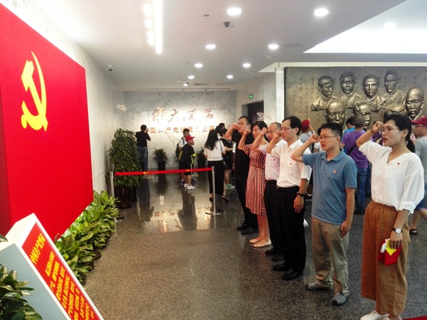 參觀完畢后,大家站在一樓展廳的黨旗面前,由支部書記王偉國(guó)帶領(lǐng)大家莊嚴(yán)宣誓,重溫入黨誓詞。
