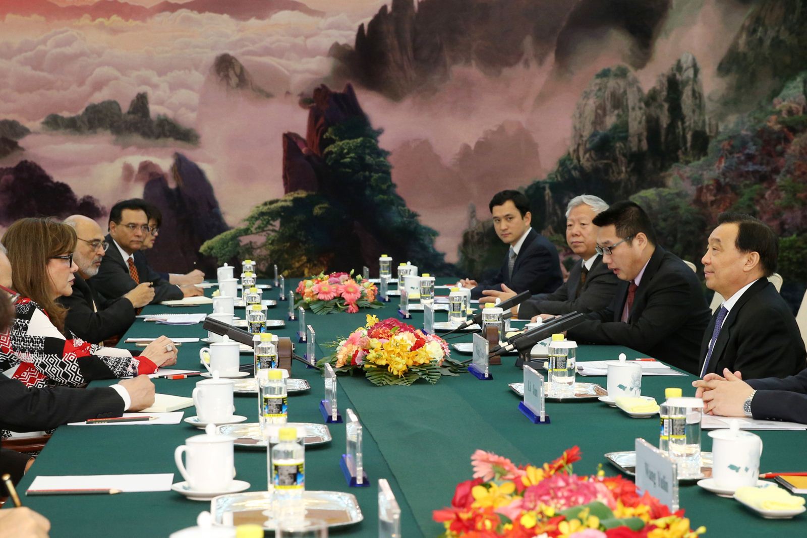 4月24日,中共中央政治局委員、全國人大常委會副委員長、中國法學會會長王晨在京會見由國家復興運動黨主席波列文斯基率領的墨西哥執政聯盟干部考察團。