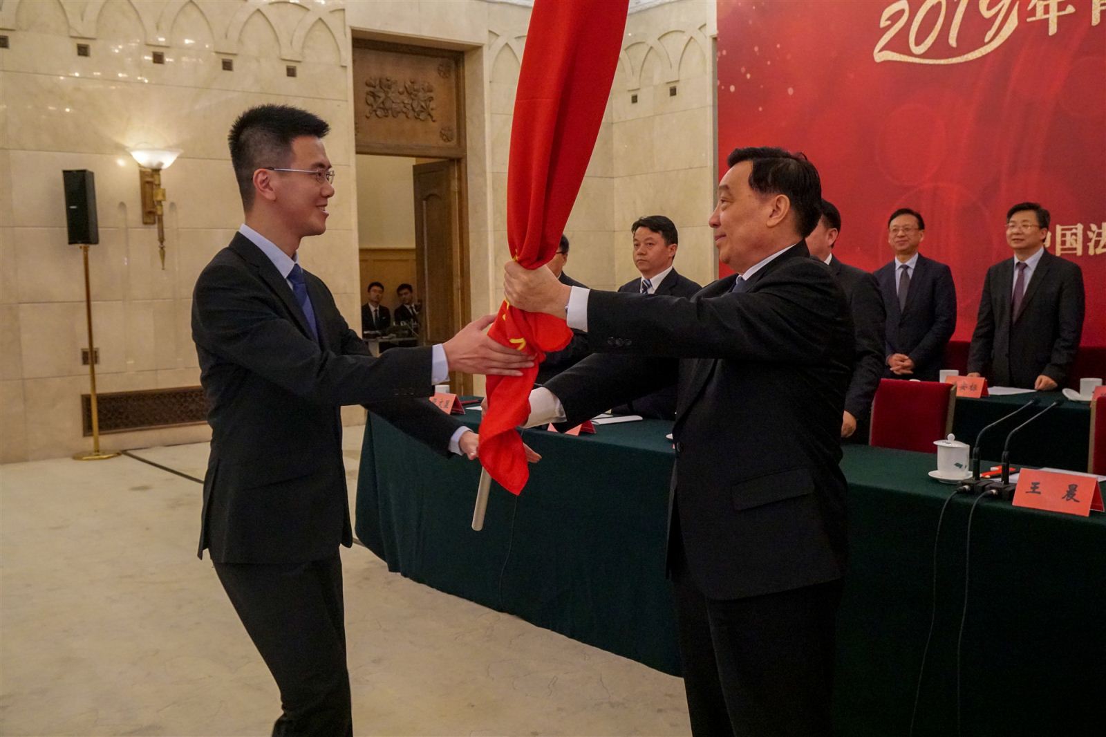 啟動儀式上,王晨向全國32個省(自治區、直轄市)和新疆生產建設兵團青年普法志愿者代表授旗。