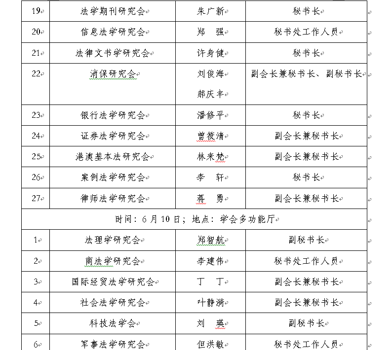 ????????6月9日上午、10日上午,研究部在學會多功能廳分別召開了兩場研究會秘書長專題工作會議,就研究會工作、支持經費使用和秘書長建設等問題進行座談。49個中國法學會所屬研究會的秘書長及有關負責同志參加會議。研究部主任李仕春、副主任李存捧,學術組織處處長張濤、調研員王小紅,社團管理處副處長劉海燕、主任科員沈苗苗參加會議。會議由李存捧副主任主持。