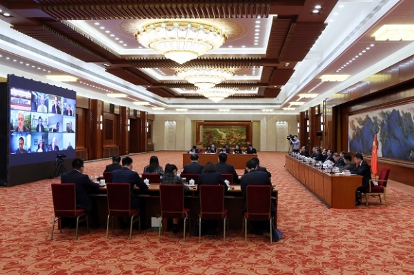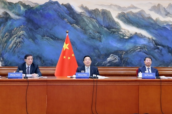 中共中央政治局委員、全國人大常委會副委員長、中國法學會會長王晨2月2日在京與德國聯邦議院副議長弗里德里希共同主持中國全國人大與德國“中國之橋”協會視頻會議并致辭。