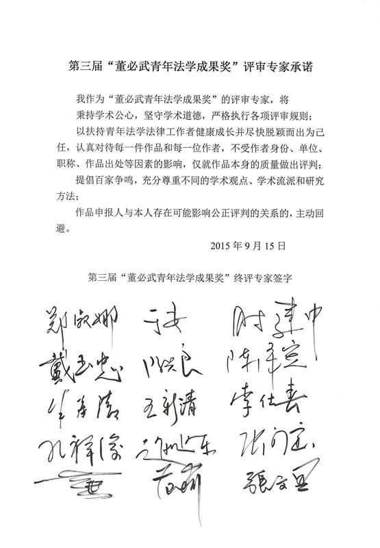 ????????至此,歷時3個半月征集、1個月評審的第三屆“董必武青年法學成果獎”評選活動,已接近尾聲。終評結果將在“中國法學會網”、“中國法學創新網”上進行公示。“董必武青年法學成果獎”獎勵委員會將以中國法學會的名義,對獲獎者頒發榮譽證書,并邀請中央有關部門的領導同志在第十屆中國法學青年論壇開幕式上進行頒獎。